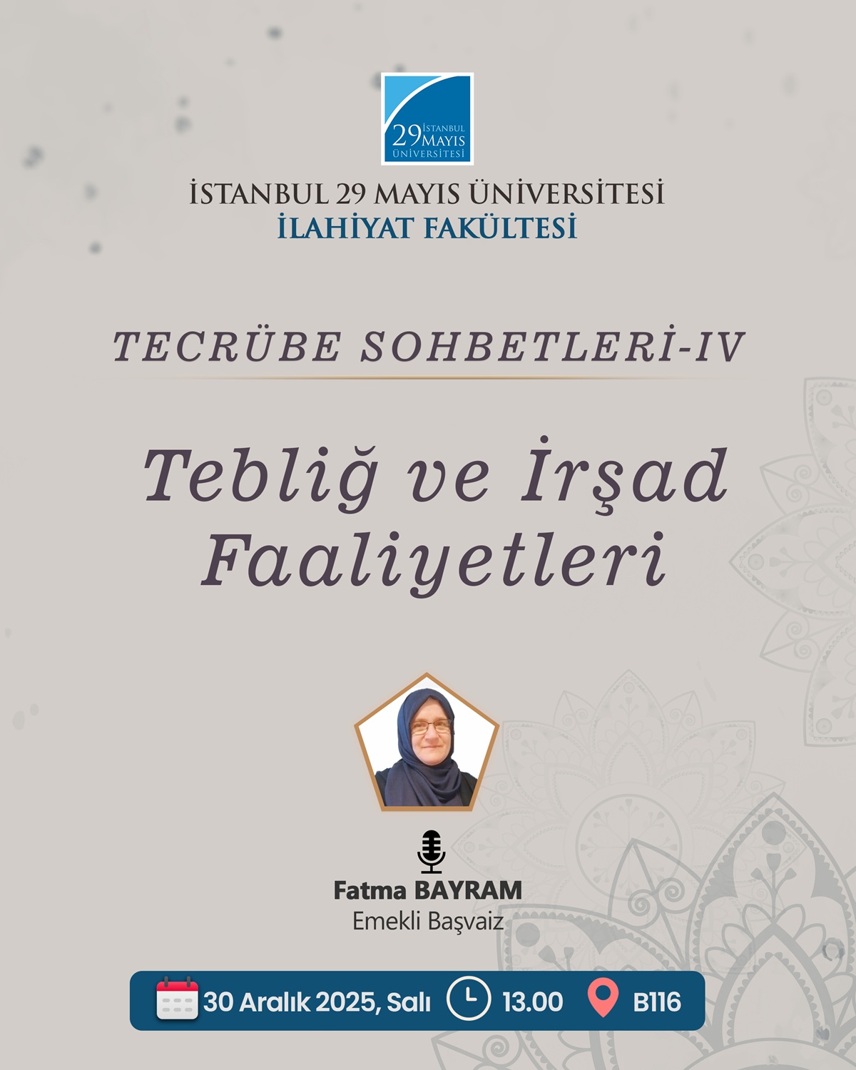 İlahiyat mezunu olduğunuzda ilerleyebileceğiniz farklı alanları tanımanız ve uzman hocalarımızla tanışarak onların tecrübelerinden istifade etmeniz amacıyla gerçekleştirdiğimiz tecrübe sohbetlerimizin dördüncüsünde "Tebliğ ve İrşad Faaliyetleri" başlığı ile emekli Başvaiz Fatma Bayram Hoca'yı ağırlayacağız.